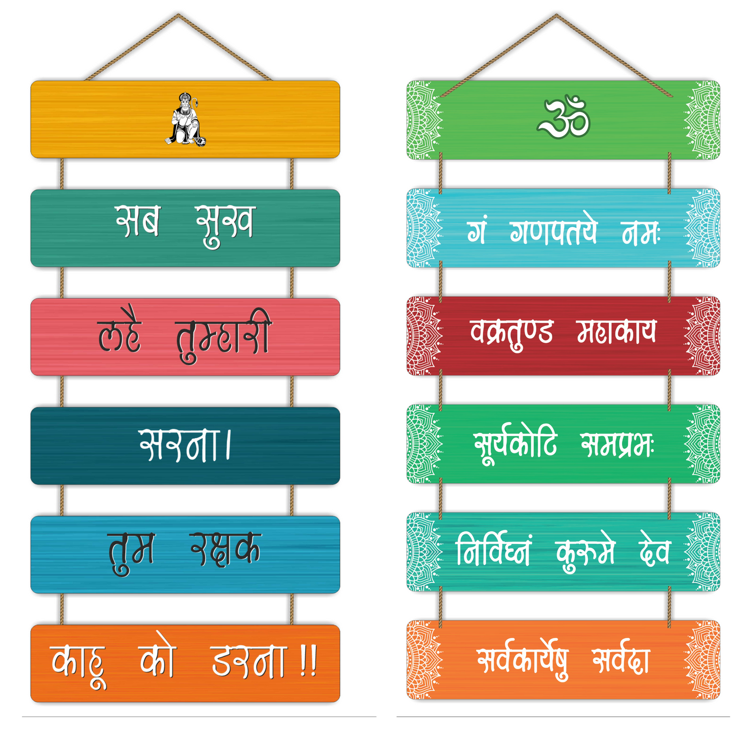 Spiritual wall hangings featuring the Gayatri Mantra, Hanuman Chalisa, and Sri Ganesh...